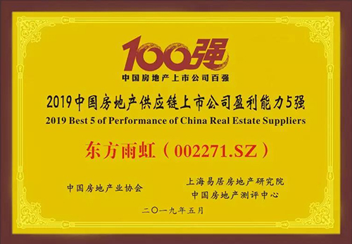 5月23日,由中國房地產(chǎn)業(yè)協(xié)會、上海易居房地產(chǎn)研究院中國房地產(chǎn)測評中心聯(lián)合開展的“2019中國房地產(chǎn)上市公司測評成果發(fā)布會”在香港召開。東方雨虹憑借強(qiáng)大的綜合實力,榮獲“2019中國房地產(chǎn)供應(yīng)鏈上市公司盈利能力五強(qiáng)”。