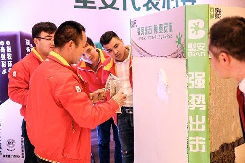 民建公司高級(jí)產(chǎn)品經(jīng)理潘佳對(duì)壁安全品類產(chǎn)品做詳細(xì)介紹。大會(huì)共發(fā)布壁安產(chǎn)品21種,涵蓋瓷磚膠、膩?zhàn)臃邸⒔缑鎰?、堵漏寶、填縫劑、防水等品類。為更好地展示產(chǎn)品性能,合肥當(dāng)?shù)刂吖ざ艓煾岛鸵庀蚩蛻衄F(xiàn)場(chǎng)對(duì)部分產(chǎn)品進(jìn)行試刷,并邀請(qǐng)與會(huì)嘉賓上臺(tái)感受產(chǎn)品的施工體驗(yàn)。