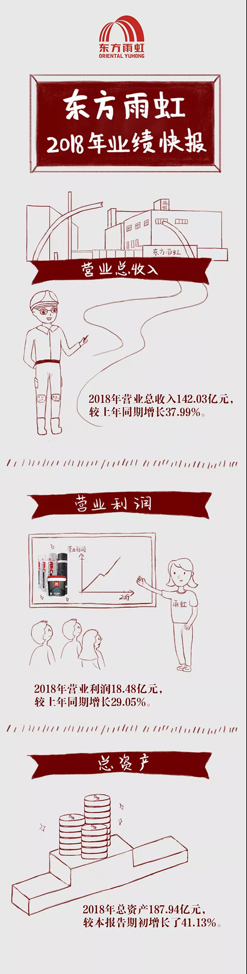 2月25日,東方雨虹公告2018年度業(yè)績快報(bào)。 報(bào)告期內(nèi),公司實(shí)現(xiàn)營業(yè)總收入142.03億元,較上年同期增長37.99%,主要系隨著公司品牌影響力不斷提升,產(chǎn)品銷量同比增長,材料銷售業(yè)務(wù)和施工服務(wù)業(yè)務(wù)規(guī)模均有所增長所致;營業(yè)利潤18.48億元,較上年同期增長29.05%;利潤總額18.52億元,較上年同期增長28.91%;歸屬于上市公司股東的凈利潤15.18億元,較上年同期增長22.54%;基本每股收益1.01元,較上年同期增長21.69%,主要原因是報(bào)告期公司營業(yè)狀況整體向好,主要產(chǎn)品的銷售收入、施工收入繼續(xù)增加,毛利潤逐步提高所致。 報(bào)告期公司財(cái)務(wù)狀況良好,截至2018年12月31日,公司總資產(chǎn)187.94億元,較本報(bào)告期初增長了41.13%,主要是公司經(jīng)營規(guī)模擴(kuò)大所致。
