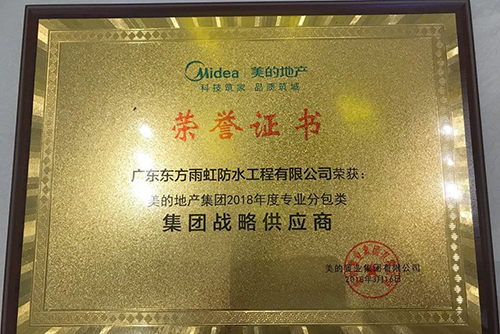 3月16日,由美的地產(chǎn)集團舉辦的“守心拓路 敦行致遠”----2018年供應商年會暨2017年度優(yōu)秀供應商表彰大會在佛山高明美的鷺湖國際會議中心召開。廣東東方雨虹從眾多知名品牌供應商中脫穎而出,榮獲美的地產(chǎn)集團專業(yè)分包類“集團戰(zhàn)略供應商”榮譽稱號。廣東東方雨虹董事長楊浩成應邀出席會議并代表領獎。