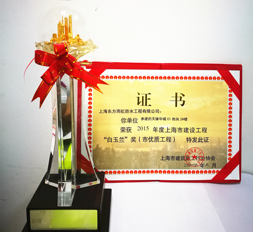 8月,上海東方雨虹參建的天緣華城C1地塊1#樓、2#樓榮獲2015年度上海市建設(shè)工程“白玉蘭”獎(市優(yōu)質(zhì)工程)榮譽(yù)稱號。 上海市建設(shè)工程“白玉蘭”獎是由上海市建筑施工行業(yè)協(xié)會頒發(fā),旨在促進(jìn)上海建筑業(yè)誠信建設(shè),提升上海市建設(shè)工程質(zhì)量水平,提高企業(yè)市場競爭力和品牌影響力,同時也培養(yǎng)了一批批能工巧匠和優(yōu)秀項目管理人才,錘煉了一支支素質(zhì)優(yōu)良的施工隊伍,推動了上海建筑業(yè)的健康發(fā)展。 2010年至今,上海東方雨虹參建的白玉蘭項目已達(dá)40余個,此次獲獎的天緣華城項目位于上海市祁連山路,上大板塊,地理位置優(yōu)越,是由大華集團(tuán)投資建設(shè)。上海東方雨虹作為大華集團(tuán)防水供應(yīng)商,已與大華集團(tuán)合作十余年之久。此項殊榮不僅使上海東方雨虹區(qū)域品牌形象得到進(jìn)一步提升,擴(kuò)大了公司在華東市場的影響力,更是雙方合作共贏的體現(xiàn),為雙方更深入的合作奠定了堅實(shí)的基礎(chǔ)。 上海東方雨虹自成立以來,一直踐行“為人類為社會創(chuàng)造持久安全的環(huán)境”的企業(yè)使命,致力于“讓老百姓住上不漏水的房子”。東方雨虹不僅專注高品質(zhì)的產(chǎn)品,更專注于為客戶提供系統(tǒng)服務(wù),成為集產(chǎn)品、技術(shù)、服務(wù)和解決方案為一體的全球化防水系統(tǒng)服務(wù)商。在產(chǎn)品質(zhì)量、施工質(zhì)量、服務(wù)質(zhì)量管控方面始終高標(biāo)準(zhǔn)、嚴(yán)要求,堅持精益求精,著力打造質(zhì)量優(yōu)質(zhì)工程項目。