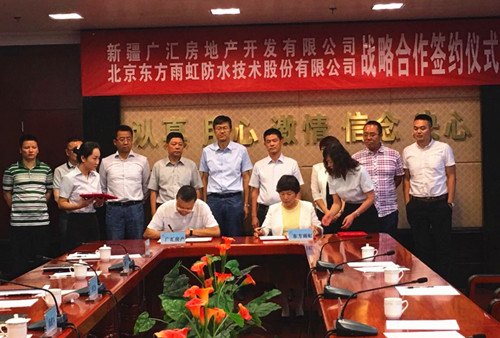8月3日,新疆廣匯房地產(chǎn)開發(fā)有限公司與東方雨虹在廣匯集團總部簽訂戰(zhàn)略合作協(xié)議。廣匯實業(yè)集團董事、房產(chǎn)置業(yè)總經(jīng)理楊鐵軍,實業(yè)集團董事局秘書李文強,房產(chǎn)置業(yè)集團總工程師王斌,開發(fā)公司副總經(jīng)理熊煒,招采中心主任賈建軍,人力資源行政部部長申強;東方雨虹防水集團副總裁張志萍,工程渠道事業(yè)部西北區(qū)總經(jīng)理楊海明,工程渠道事業(yè)部新疆區(qū)域總經(jīng)理路曉征,工程渠道事業(yè)部新疆區(qū)域經(jīng)理李曉璐等出席簽約儀式。