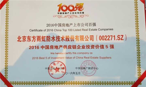 5月26日,由中國房地產(chǎn)業(yè)協(xié)會、中國房地產(chǎn)測評中心聯(lián)合開展的“2016中國房地產(chǎn)上市公司測評成果發(fā)布會暨上市房企高峰論壇”在香港盛大舉行,《2016中國房地產(chǎn)上市公司測評研究報告》等測評研究成果火熱出爐。東方雨虹獲評“2016中國房地產(chǎn)供應(yīng)鏈上市公司投資價值5強”。