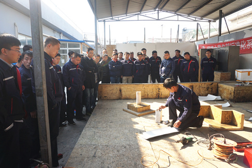 下午,《單程防水卷材屋面工程技術(shù)規(guī)程》及《TPO事業(yè)部施工流程梳理及材料管理》的宣貫,讓與會(huì)人員明確掌握了工程技術(shù)及施工過(guò)程中的規(guī)章制度,項(xiàng)目經(jīng)理組和工人代表組也就項(xiàng)目管理的經(jīng)驗(yàn)與施工技術(shù)作了分享,新同事們?nèi)绔@至寶,現(xiàn)場(chǎng)提問(wèn)、討論同步進(jìn)行。 頒獎(jiǎng)環(huán)節(jié),現(xiàn)場(chǎng)為T(mén)PO事業(yè)部?jī)?yōu)秀項(xiàng)目經(jīng)理王海東、崔巖,優(yōu)秀施工班組張廣志,優(yōu)秀施工員李冰,優(yōu)秀新人鐘魚(yú),優(yōu)秀施工隊(duì)長(zhǎng)高明坤等人頒發(fā)獎(jiǎng)勵(lì)及證書(shū)。 本次培訓(xùn)還組織TPO細(xì)部節(jié)點(diǎn)實(shí)操大賽,由2015中國(guó)屋面防水大師徐龍瀟現(xiàn)場(chǎng)演示陰陽(yáng)角和管根的標(biāo)準(zhǔn)化施工實(shí)操及講解。TPO事業(yè)部的所有施工管理人員及班組組長(zhǎng)聚精會(huì)神觀看,精益求精的施工工法引來(lái)陣陣驚嘆。