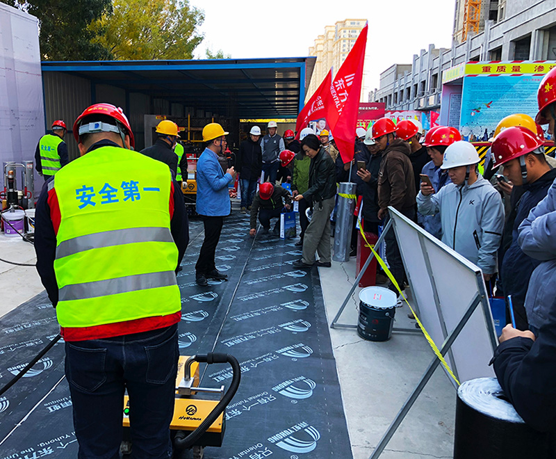會上,東方雨虹對近幾年被廣泛應用于現(xiàn)代建筑中的非固化復合防水體系的產(chǎn)品特點和施工工藝進行詳細講解。為了提高建筑防水施工效率,并減少人為因素造成的誤差,東方雨虹技術人員現(xiàn)場展示了“虹人”智能型熱熔防水卷材攤鋪機車“坦途”和“騎行者”在平面熱熔滿粘施工和熱熔瀝青卷材搭接邊焊接中的應用。