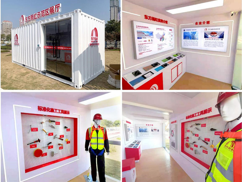 該項目以白色集裝箱為主體,運輸方便靈活,便于吊裝到其他工地項目;其內(nèi)部采用了圖文、實物和模型(沙盤)等多種形式,對東方雨虹的企業(yè)形象、建筑建材、產(chǎn)品體系、標(biāo)準(zhǔn)化施工等情況進(jìn)行重點展示。
