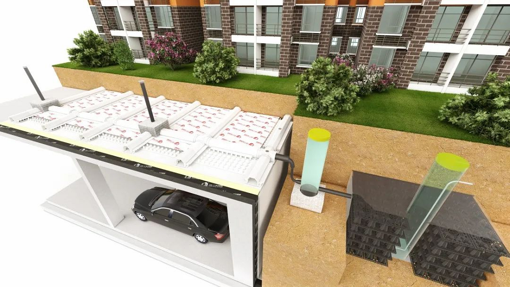 雨虹桃花源防排蓄水系統(tǒng),由虹吸復(fù)合排水板、水槽、透氣管、阻根模塊、虹吸管、觀察井、雨水模塊組成。該系統(tǒng)核心組件——虹吸復(fù)合排水板覆蓋在頂板之上,可直接覆蓋種植土壤。雨水通過土壤層、虹吸復(fù)合排水板的土工布層過濾,匯集至排水槽,再通過虹吸作用被抽入沉淀觀察井,實(shí)現(xiàn)防水、排水、雨水回收利用三重功能。