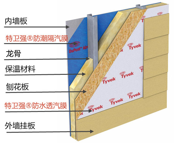 防水透汽膜在輕鋼結(jié)構(gòu)或木結(jié)構(gòu)的應(yīng)用是其最早的應(yīng)用方式,一方面其防風性能給建筑提供了一道很好的氣密屏障,降低了空氣滲透導致的對流散熱,讓建筑更節(jié)能;另一方面其透汽性能幫助圍護結(jié)構(gòu)內(nèi)的水蒸氣擴散,避免建筑受冷凝的損害,保持結(jié)構(gòu)的自然干燥,提高輕鋼或木結(jié)構(gòu)主體的使用壽命。
