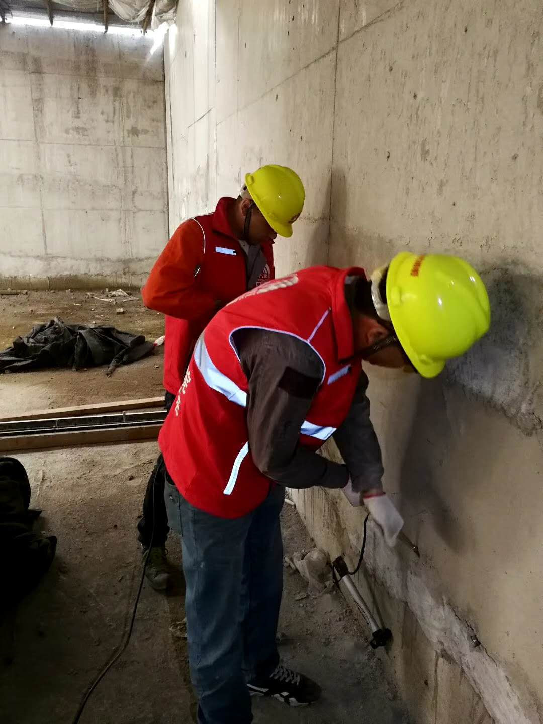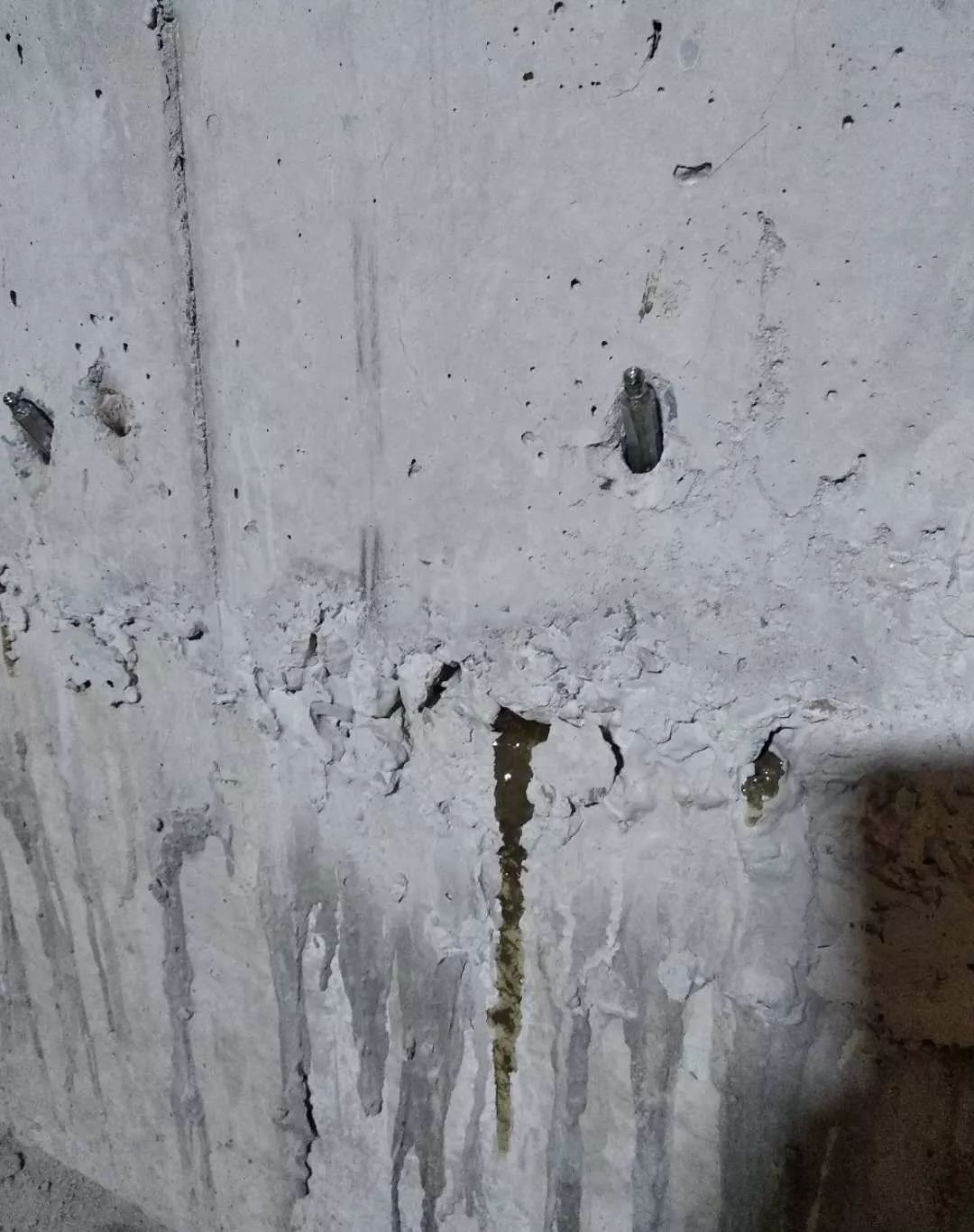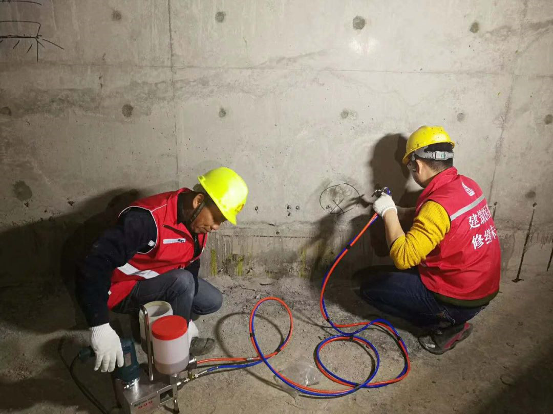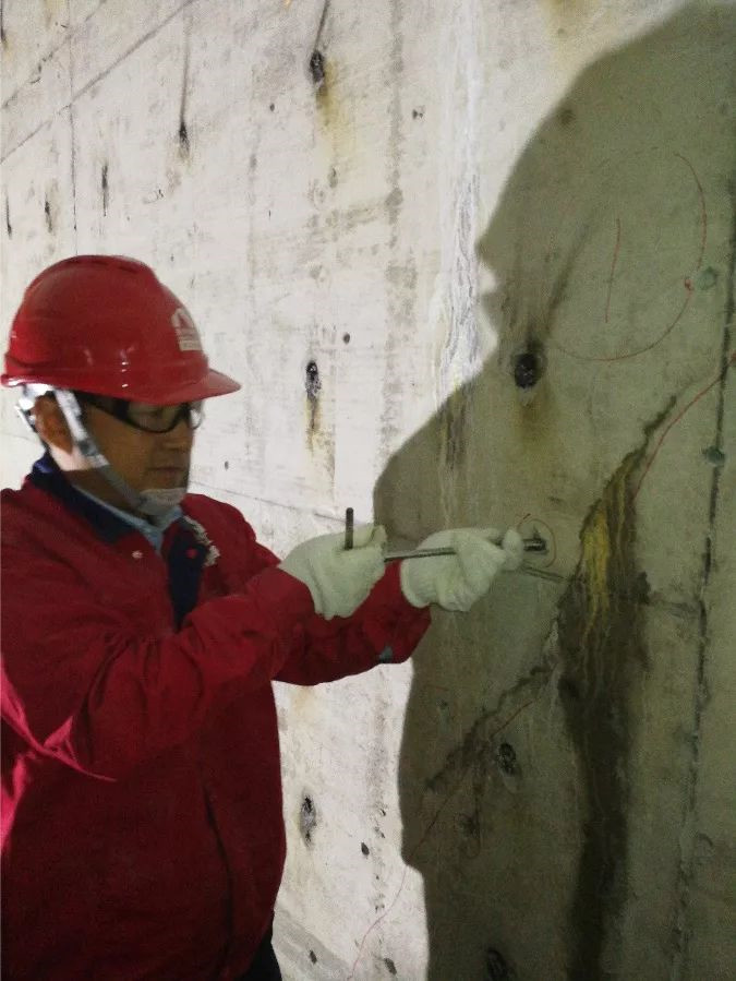 灌漿針頭需要取出,用堵漏2#進(jìn)行孔洞封堵。灌漿針頭為鋁制品。如果殘留在墻體內(nèi)部,由于其和混凝土的熱脹冷縮系數(shù)不同,將來容易在針頭針頭周邊因?yàn)闇囟葢?yīng)力形成裂縫。