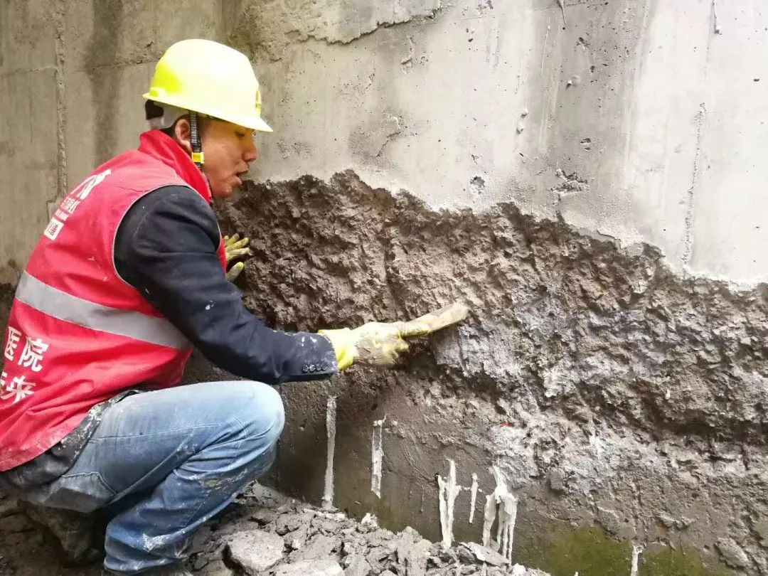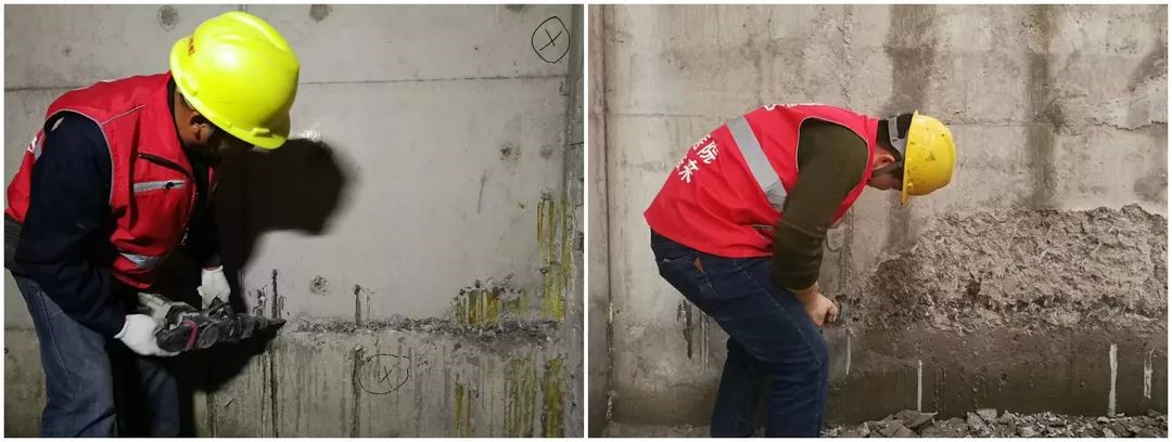 采用凝結(jié)時(shí)間較長的堵漏2#進(jìn)行封堵作業(yè)。避免因?yàn)槟Y(jié)速度過快,造成裂縫的產(chǎn)生。清除部位用抗?jié)B1#做整體背防,恢復(fù)混凝土的設(shè)計(jì)強(qiáng)度。