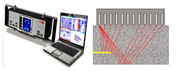 如果構(gòu)件內(nèi)部的混凝土-空氣界面(缺陷)足夠大,一部分激發(fā)的應(yīng)力脈沖會(huì)被該缺陷提前發(fā)射。如右圖所示,因?yàn)樯渚€路徑更短,由缺陷反射的信號(hào)會(huì)早于構(gòu)件底面反射的信號(hào)到達(dá)接收端。信號(hào)處理軟件依據(jù)每排換能器接收到的反射脈沖的到達(dá)時(shí)間,來推斷構(gòu)件內(nèi)部缺陷的位置。