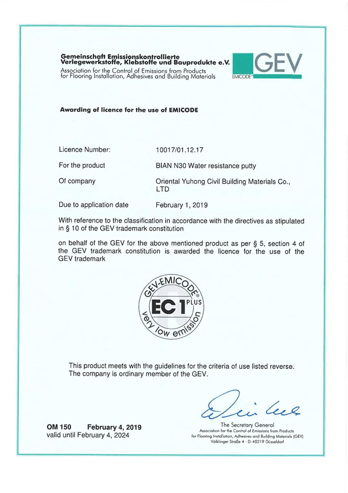 壁安抗堿防霉型N30耐水膩?zhàn)油ㄟ^歐洲建材環(huán)保性能權(quán)威認(rèn)證機(jī)構(gòu)——德國GEV建立的EMICODE分級體系最高標(biāo)準(zhǔn),獲得EC1PLUS證書,該產(chǎn)品可最大限度保證居住環(huán)境的空氣質(zhì)量。