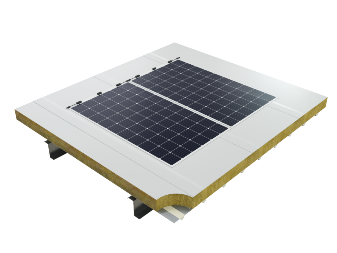 相較于普通機(jī)械固定單層屋面系統(tǒng),SWIFT輕快集成柔性屋面采用特殊工藝巖棉,容重120kg/m³的前提下即可滿足JGJ/T 316《單層防水卷材屋面工程技術(shù)規(guī)程》對巖棉保溫材料的性能指標(biāo)要求(60kPa的壓縮強(qiáng)度下,壓縮比不應(yīng)大于10%,500N的點(diǎn)荷載作用下,變形量不應(yīng)大于5mm)*。底板采用WISKIND優(yōu)質(zhì)鍍鋅鋼板,厚度0.6mm制成波高35mm,板寬100mm的壓型鋼板。降低整個(gè)屋面系統(tǒng)荷載,為屋面分布式光伏電站安裝預(yù)留更多空間*。