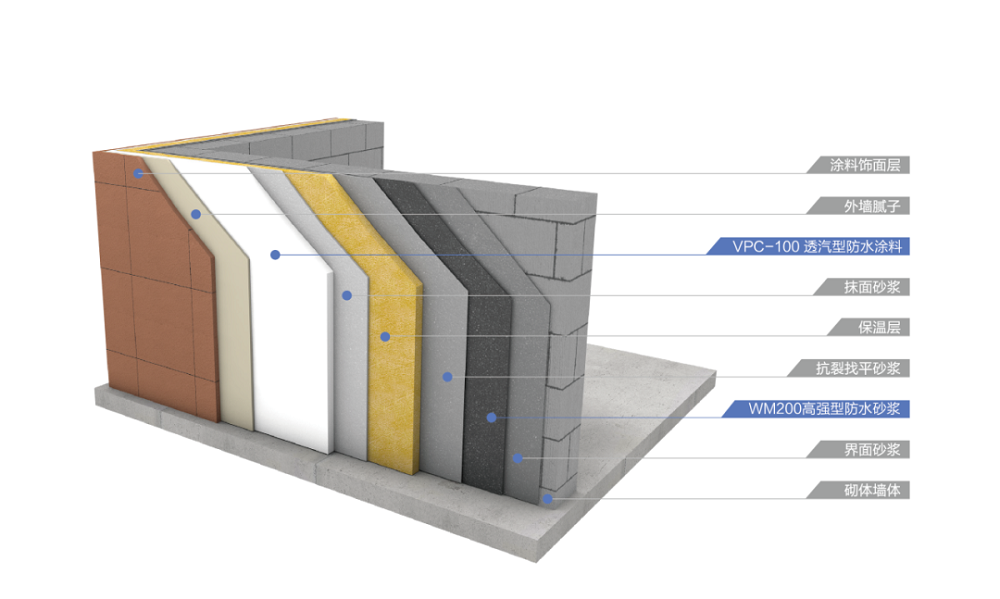 在此背景下,東方雨虹將《防水強(qiáng)條》規(guī)范、外墻防水工程痛點(diǎn)、市場(chǎng)需求,與自身豐富的實(shí)踐與探索經(jīng)驗(yàn)相結(jié)合,推出外墻防水專用新品——VPC-100透汽型柔性防水涂料。在實(shí)際應(yīng)用中,該產(chǎn)品可與WM200高強(qiáng)型防水砂漿搭配使用構(gòu)成兩道防水層。二者組成的防水層與其他構(gòu)造層次共同構(gòu)成外墻外保溫防水透汽系統(tǒng)。